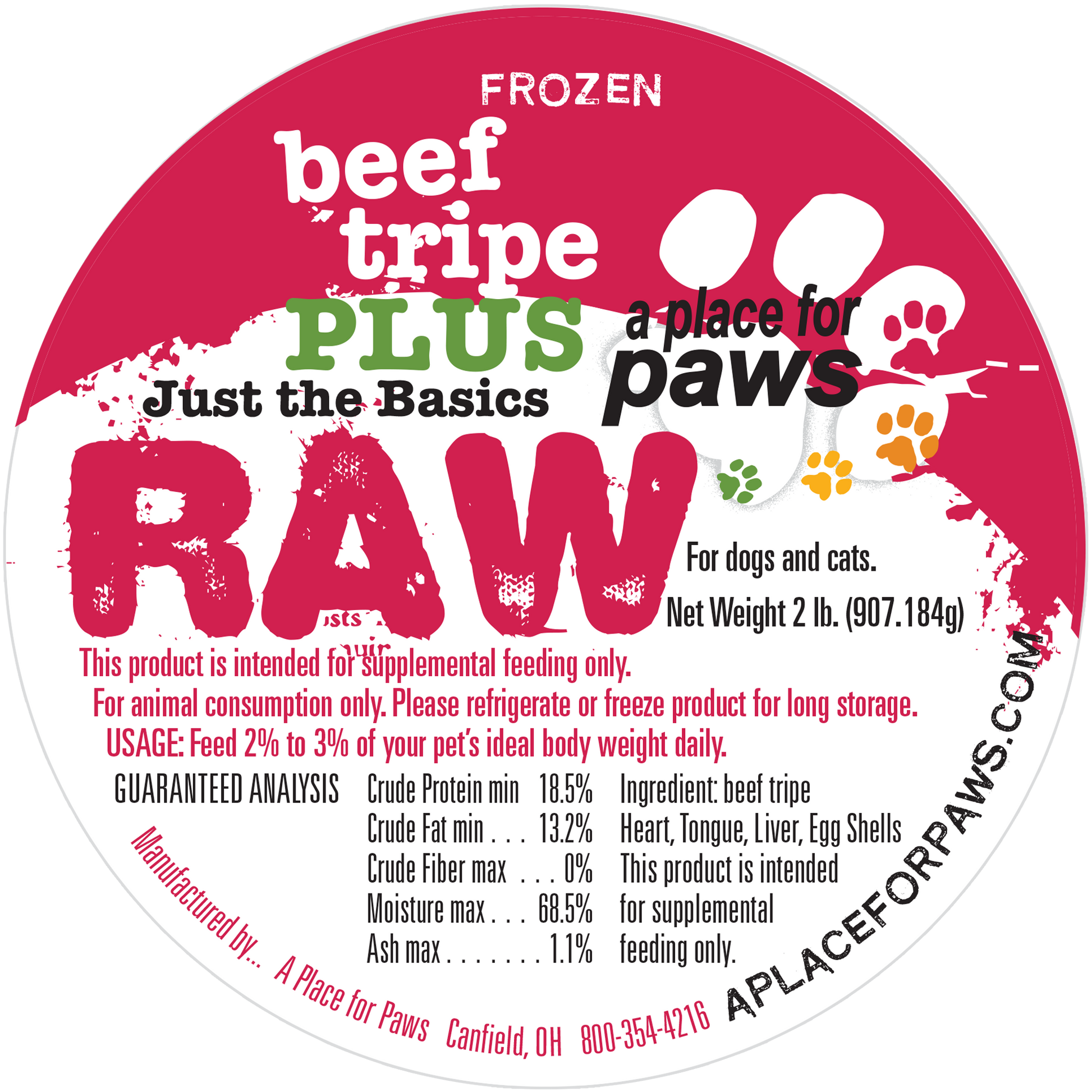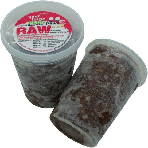 Our Beef Tripe Plus is a frozen ground raw food which comes in 1 lb., 2lb. containers and 5 lb. tubes.